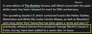 There's also a highly readable interview with Giles Martin on the tricky job of remixing a masterpiece at the BBC News website, here. At least the author of this piece - Mark Savage - bothered to do the necessary research and ascertain at exactly whose house the legendary May 1968 demos were recorded. Unlike one of his BBC colleagues who, earlier in the same day, claimed that it had been 'George Martin's house in Esher' rather than at the home of a little-known session guitarist called George Harrison.